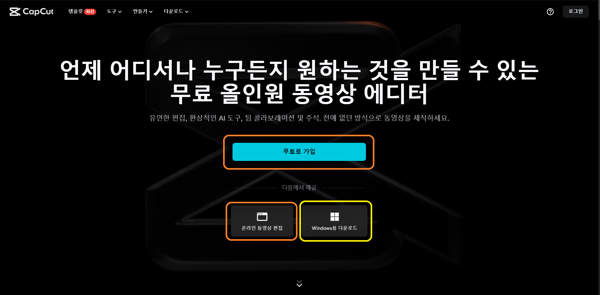 1) 먼저 위에서 알아본 바와 같이, Capcut은 위 화면에서 보실 수 있듯이, 주황색 네모 박스로 되어있는 사이트 내에서 사용하는 방식과 모바일 버전으로 사용하는 방식, 그리고 노란색 네모 박스로 되어있는 부분인 PC 버전으로 사용하는 방식, 이렇게 총 3가지 버전으로 사용이 가능합니다. 그중에서 저희는 PC 버전 사용을 위해 위 화면에서 노란색 네모 박스로 되어있는 부분인 'windows 용 다운로드'를 선택하도록 하겠습니다.