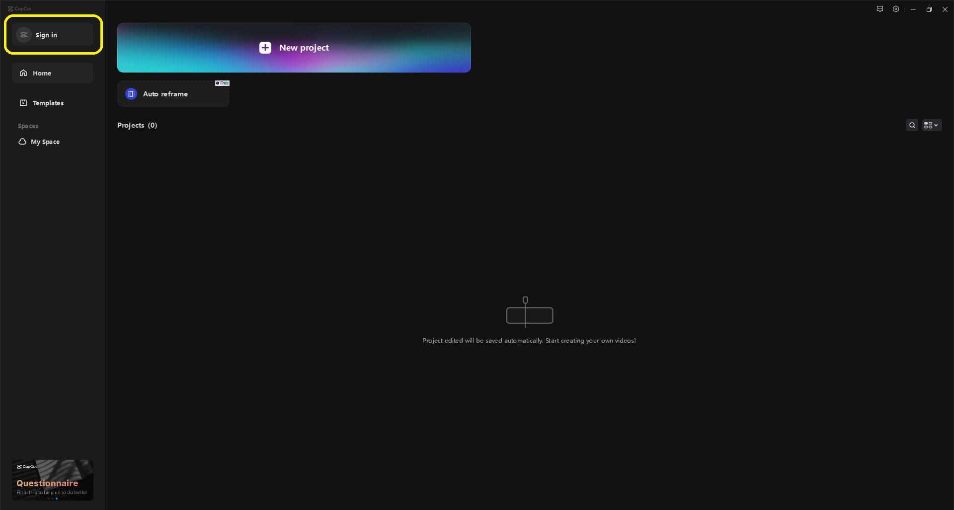 2) Capcut을 실행하시게 되면 위와 같은 화면이 나타나게 됩니다. 이때 회원가입을 위해 위 화면에서 노란색 네모 박스로 되어있는 부분인 'Sign in'을 눌러서 회원가입을 진행해주시면 됩니다.