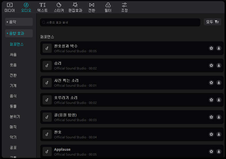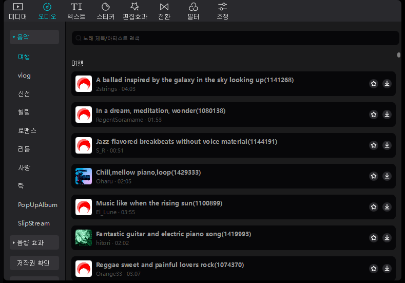 - 오디오를 선택하시게 되면 Capcut 안에 있는 다양한 음악들이 있습니다. 음악도 카테고리별(여행,vlog,신선,힐링,로맨스,리듬,사랑,락,PopUpAllbum,SlipStre am)로 나누어져 있습니다. 그리고 다양한 음향 효과도 카테고리별(퍼포먼스,싸움,웃음,전환,기계,음식,동물,분위기,매직,악기,공포,교통,BGM)로 보실 수 있습니다.