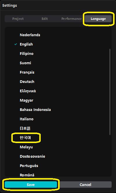 2) Settings 창이 뜨게 되는데 이때 노란색 네모 박스로 되어있는 부분을 위에서부터 아래로 순서대로 하나씩 클릭해주시면 됩니다. (Language -> 한국어 -> Save)
