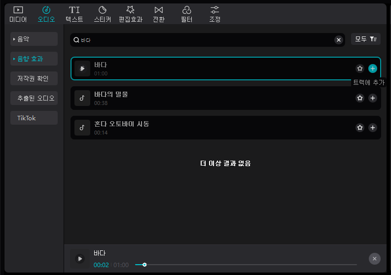 그리고 그 음악을 다운로드 해 주시고 위 화면에서 보이시는 것처럼 '트랙에 추가'를 클릭하셔서 음향 효과를 추가해주시면 됩니다.