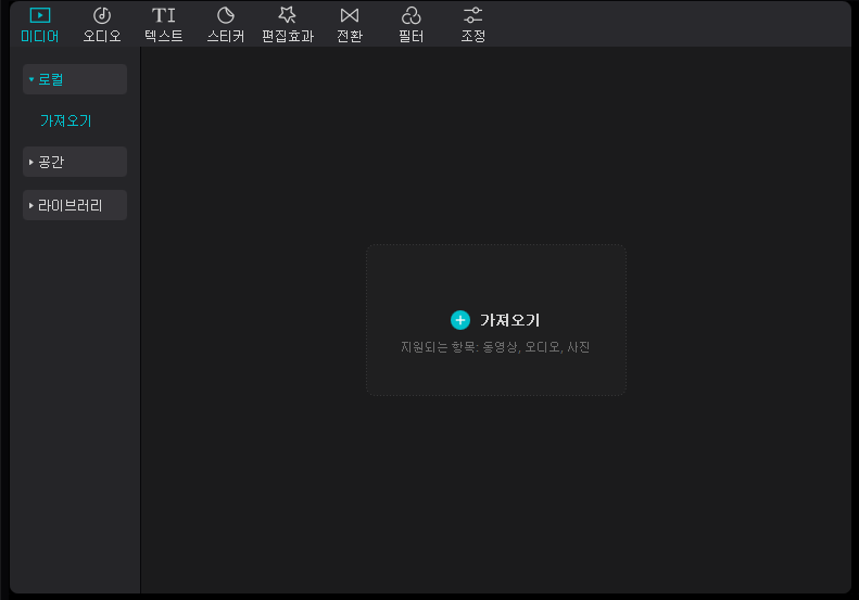 - 먼저 제일 왼쪽 상단에 있는 부분부터 알아보겠습니다. 여기서는 미디어를 클릭하시게 되면 로컬, 공간, 라이브러리가 있습니다. 이때 여러분들께서 원하시는 이미지나 영상, 오디오를 가져오시고 싶으시다면, 로컬 부분에 가져오기를 클릭하신 후 파일을 가져오시면 됩니다.