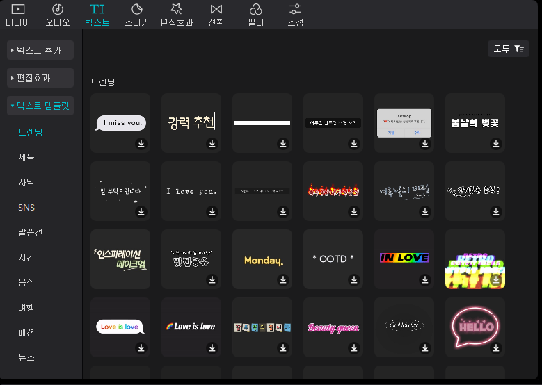 - 텍스트를 클릭하시게 되면 텍스트 추가, 편집 효과, 텍스트 템플릿 등이 있습니다. 이 중에서도 텍스트 템플릿은 여러 가지 효과가 적용된 것을 보실 수 있고, 그대로 문구만 바꿔서 사용이 가능합니다.