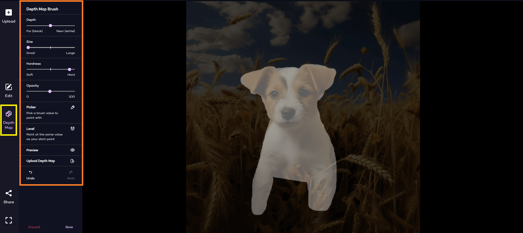 주황색 네모 박스 부분인 'Depth Map Brush' 창이 나타나게 됩니다. 이미지를 업로드하시면 기본적으로 Depth Map 부분이 세팅이 되어있으실 겁니다.