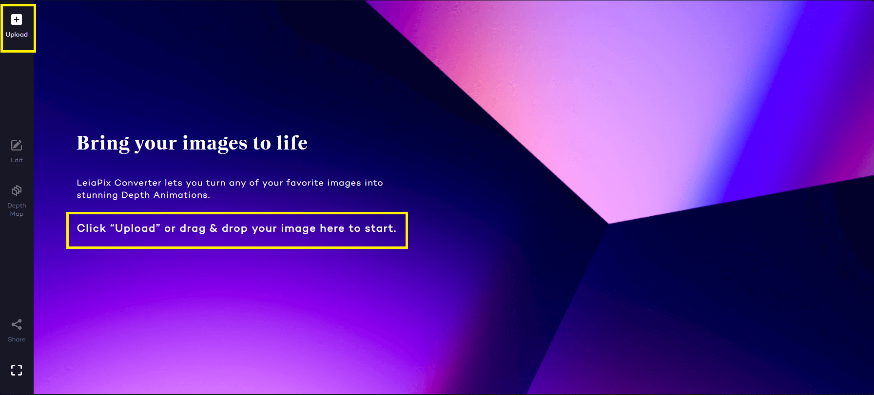 - 로그인을 하시면 위와 같은 화면이 나타나게 됩니다. 이때 노란색 네모 박스로 되어있는 부분인 왼쪽 상단의 'Upload'를 클릭하셔서 가지고 계신 이미지를 업로드해주시거나, 화면 가운데에 있는 'Click "Upload" or drag & drop your image here to start' 부분에 이미지를 드래그하셔서 가져다 놓으시면 되겠습니다.