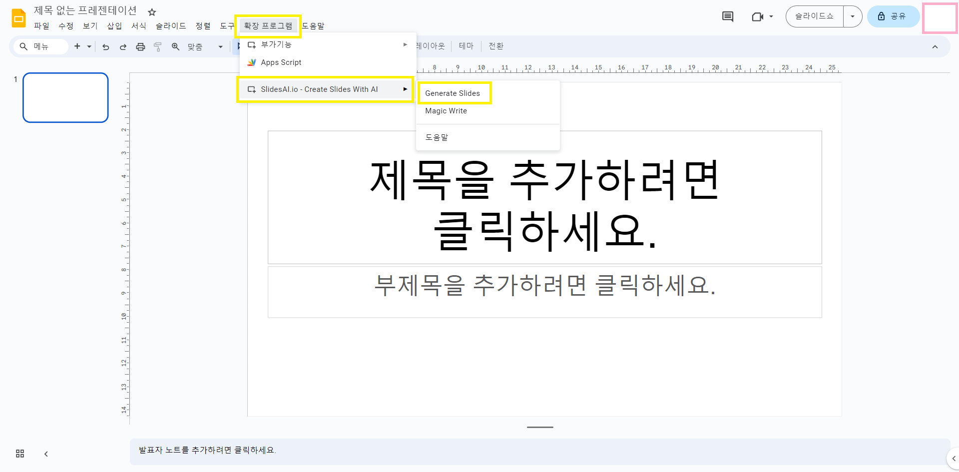 (5) 프레젠테이션을 여셨으면 위 화면에서 '확장프로그램'에 들어가셔서 아까 설치한 'Slides Ai.io - Create Slides With AI'를 찾아줍니다. 이 부분에 마우스를 가져다 놓으시면 창이 하나가 더 뜨게 됩니다. 거기서 'Generate Slides'를 클릭해줍니다.