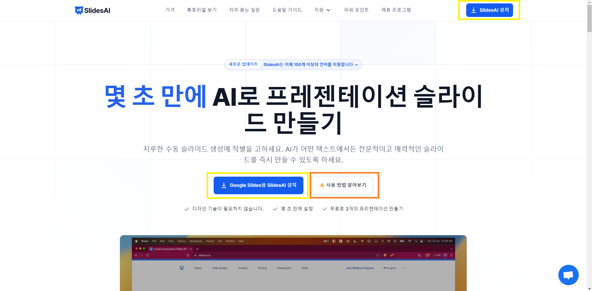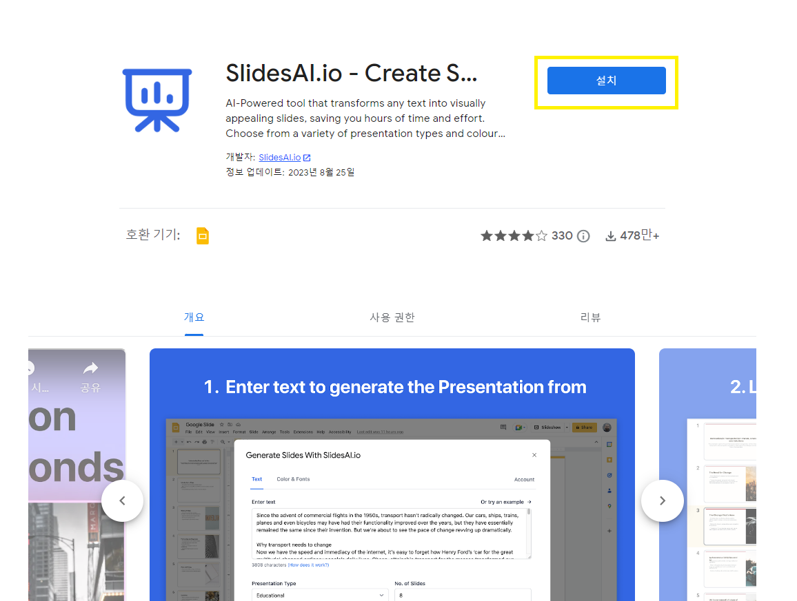 위 화면에서 노란색 네모 박스 부분인 'Google Slides 용 SlidesAI 설치' 또는 오른쪽 상단에 'Slides AI 설치'를 누르시면 됩니다.