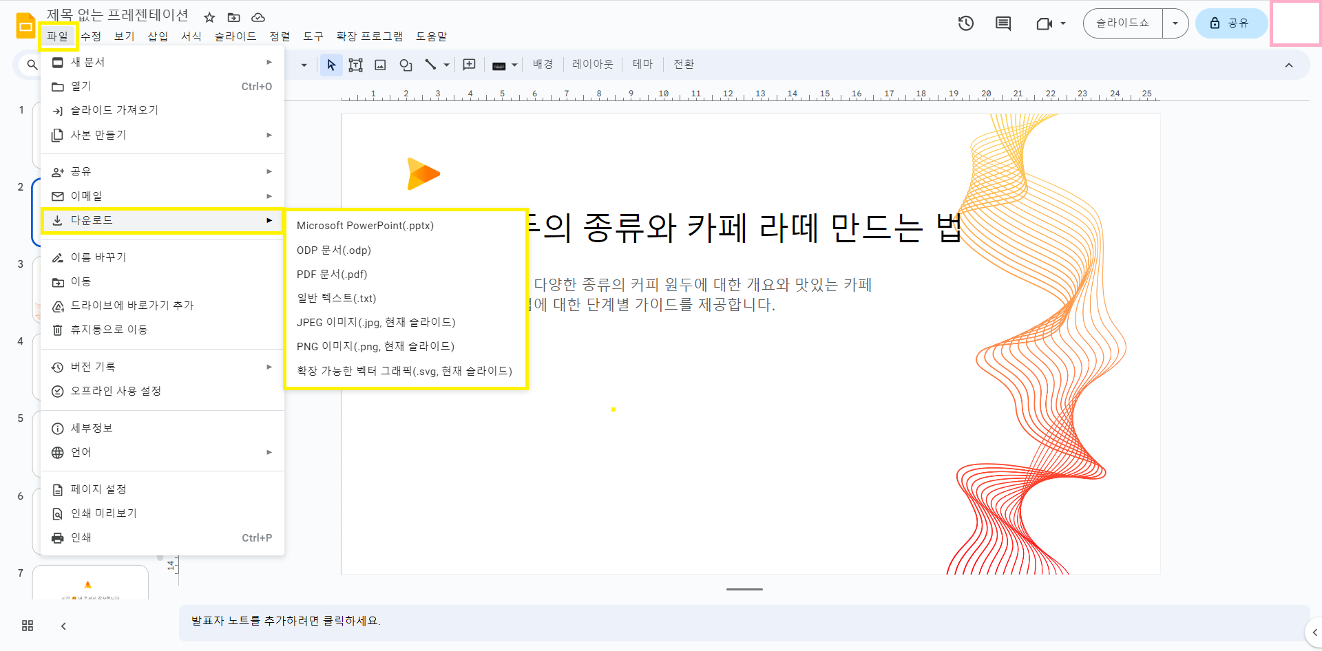 - 다 만드셨으면 위 화면에서 왼쪽 상단에 '파일'을 클릭해줍니다. 그리고 '다운로드'에 마우스를 가져다 놓으시면 다양한 형태로 다운로드받으실 수 있습니다. 이 중에서 원하시는 형태로 다운로드받아 주시면 되겠습니다.