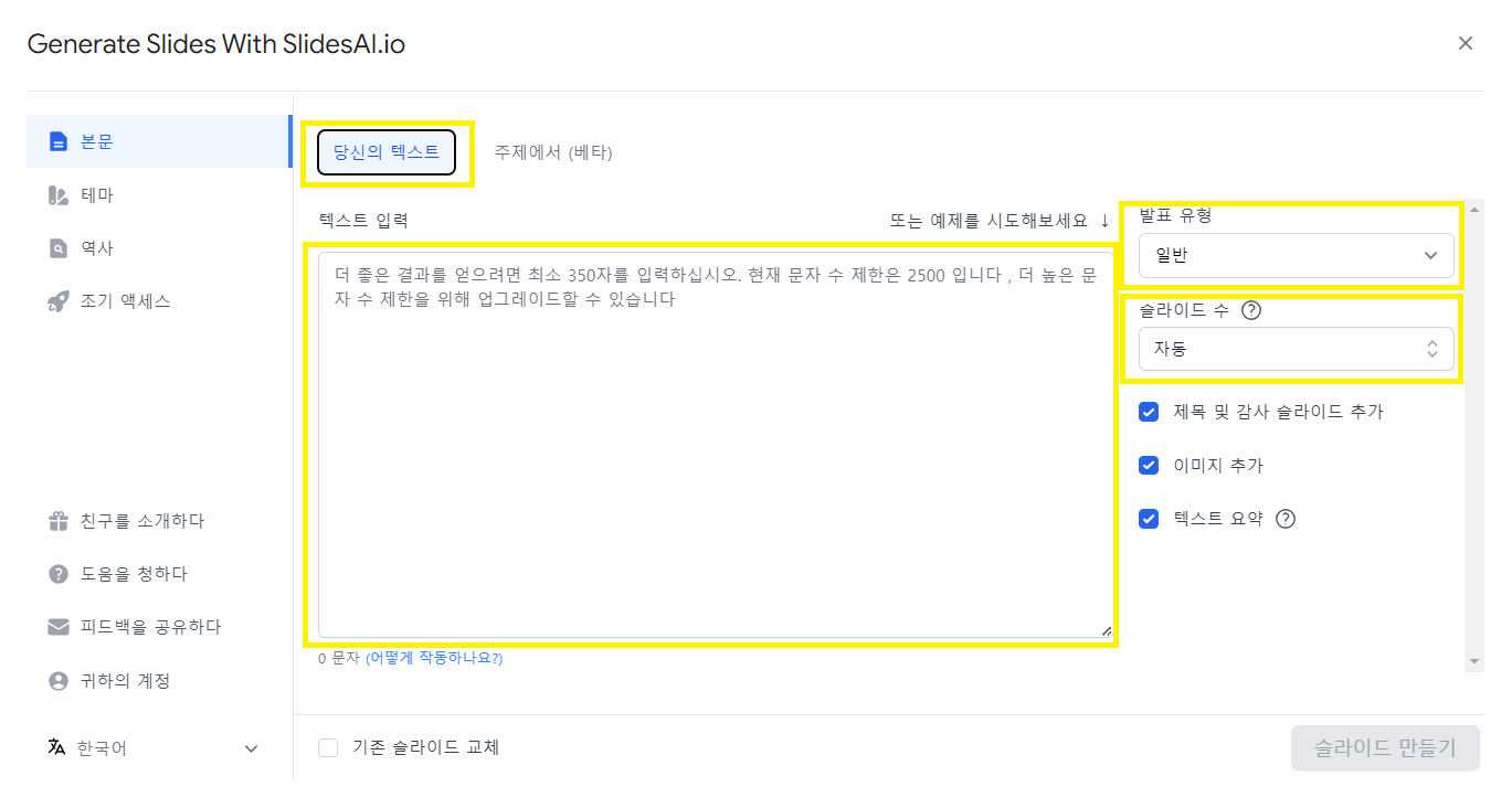 - 위 화면에서 '당신의 텍스트' 부분을 클릭해줍니다. 그러면 텍스트 입력을 할 수 있게 되고, 발표 유형, 슬라이드 수 등을 정하실 수 있습니다.