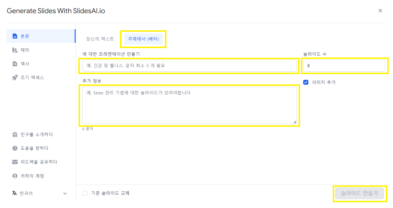 - 위 화면에서 '주제에서 (베타)'부분을 클릭해줍니다. 그러면 주제랑 추가정보, 슬라이드 수를 작성할 수 있게 됩니다.