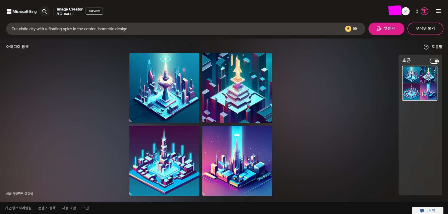 '무작위 보기'를 클릭 후 생성된 명령어는 Futuristic city with a floating spire in the center, isometric design입니다. 이렇게 만드시게 되면 총 4장의 이미지를 얻으실 수 있게 됩니다.
