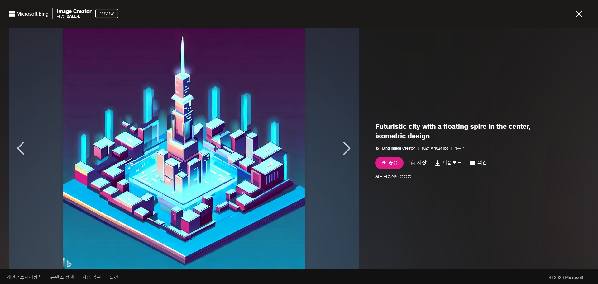 4) 생성된 이미지는 저작권 문제가 없습니다. 간혹 저작권 때문에 걱정하시는 분들이 계시데, 빙 이미지 크리에이터로 직접 생성한 이미지는 저작권 문제가 없습니다.