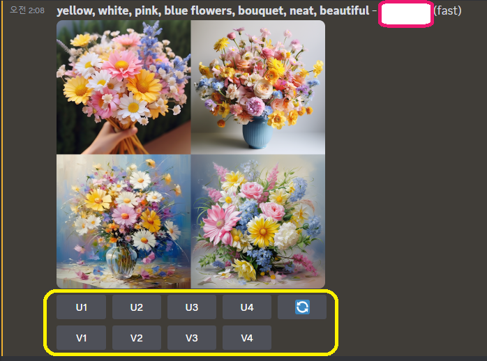 (7) 저는 프롬프트 입력 칸에 yellow, white, pink, blue flowers, bouquet, neat, beautiful이라고 입력을 해보았습니다. 그러면 위와 같이 그림이 생성되고 있는 과정을 보실 수 있는데요,