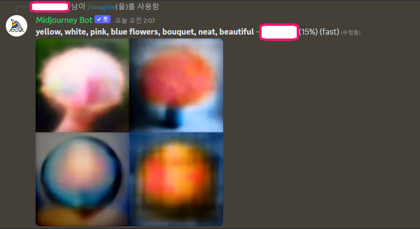 위 화면을 보시게 되면 그림이 총 4개가 나오는데 선명하지 않고 흐릿합니다. 그 이유는 미드저니가 지금 그림을 생성 중이라서 다 완성된 게 아니라서 그런 것이므로 조금 더 기다려주시면 됩니다.