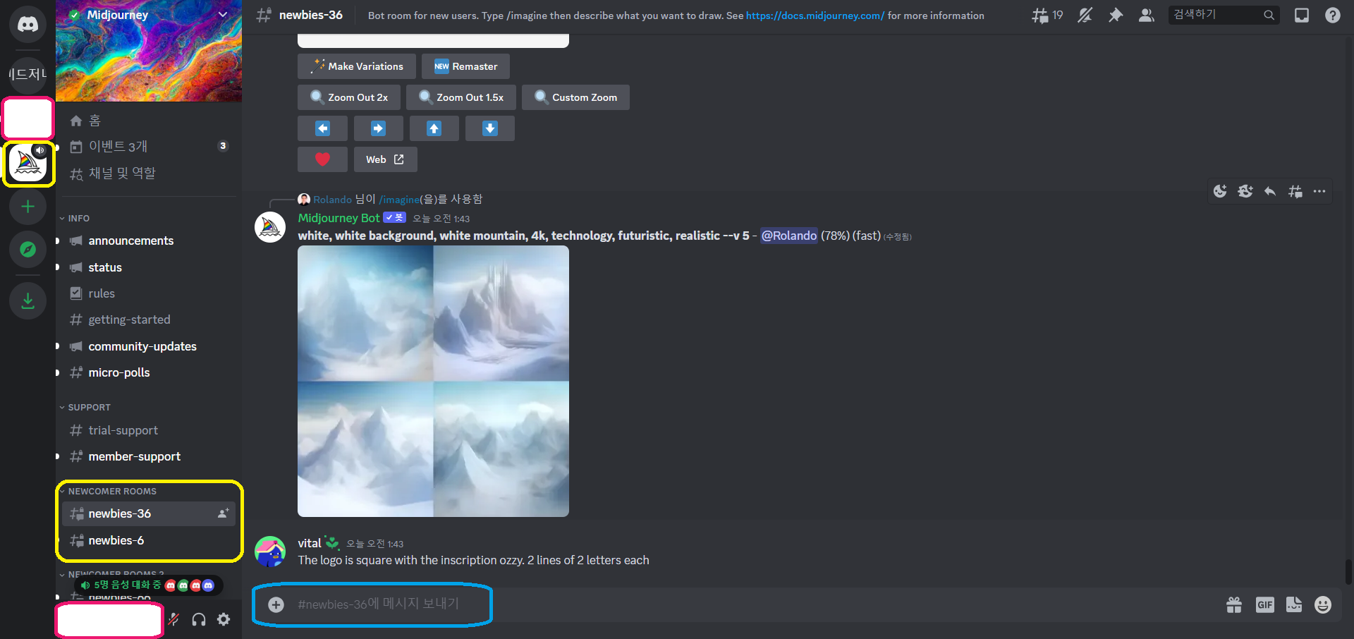 (4) 위 사진에서 왼쪽 상단 부분에 있는 노란색 네모 박스로 되어있는 돛단배 모양의 아이콘이 바로 미드저니 봇입니다. 이 미드저니 봇을 누르시게 되면 위 화면과 같이 여러 개의 채팅방이 나올 텐데요,
