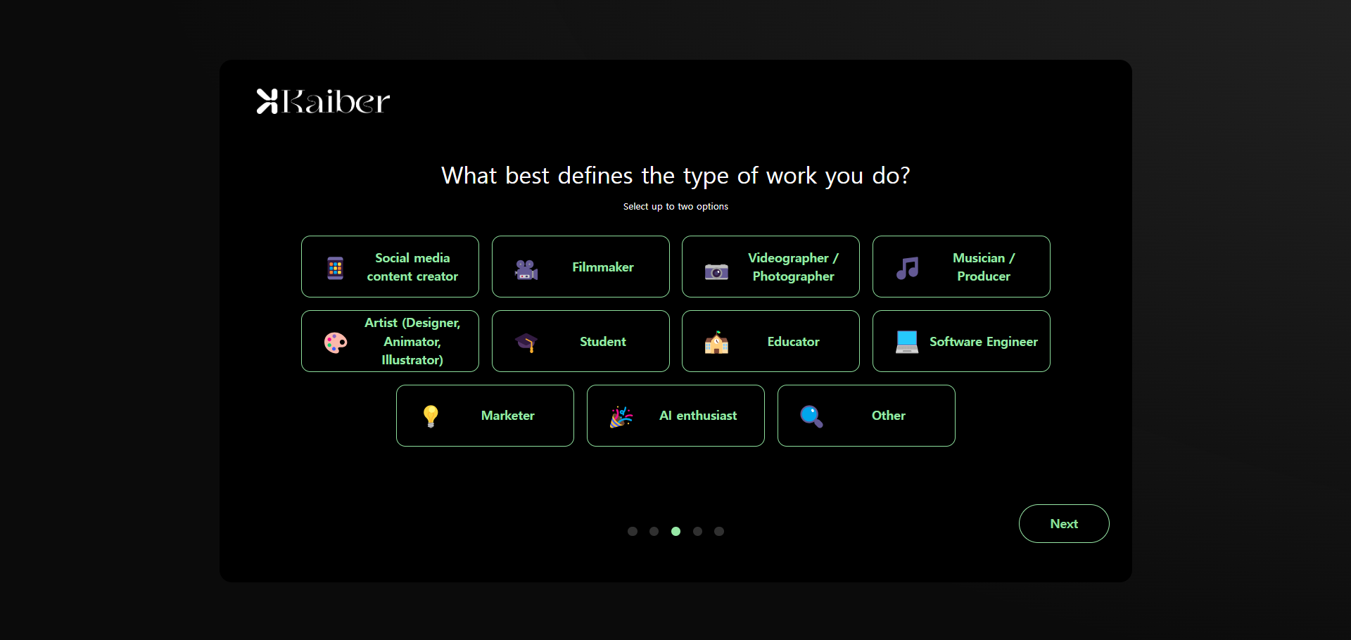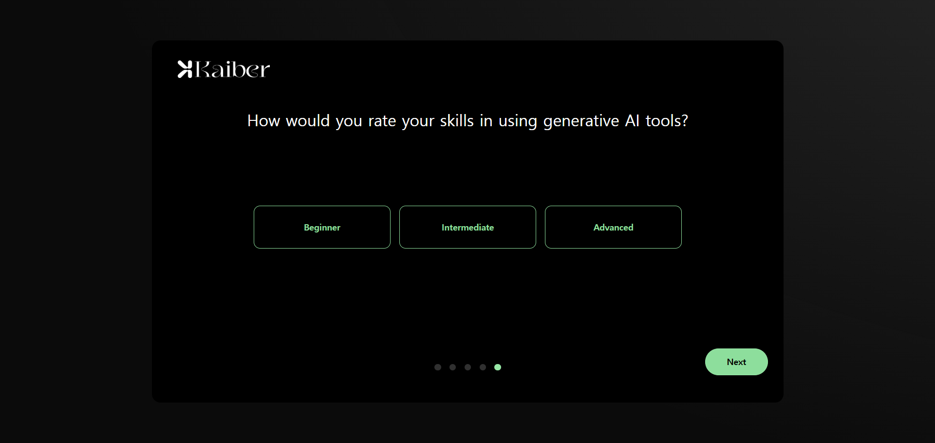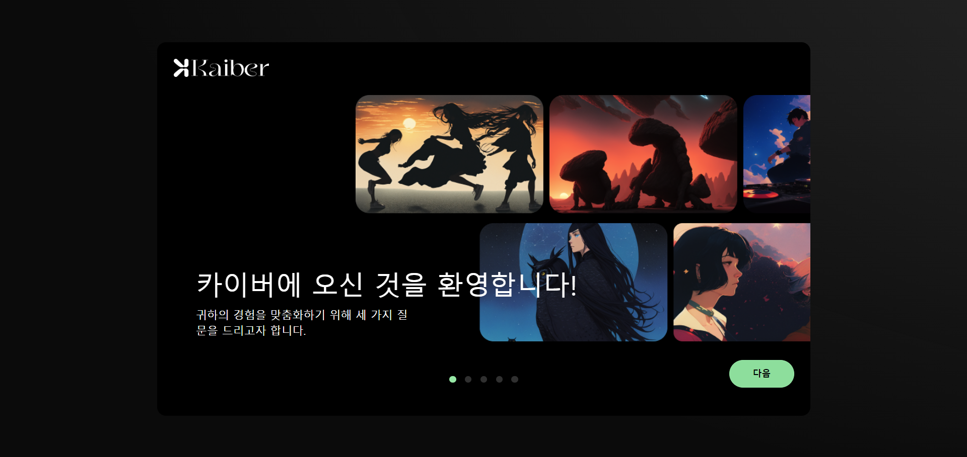 (1) Kaiber 로그인을 하시게 되면 위와 같은 화면이 나오게 됩니다. 간단하게 설문조사를 하게 되는데요, 간단한 질문 몇 가지에 대해 답변을 클릭해주시면 됩니다. 먼저 위 화면에서 오른쪽 하단에 '다음' 또는 'Next'를 눌러줍니다.