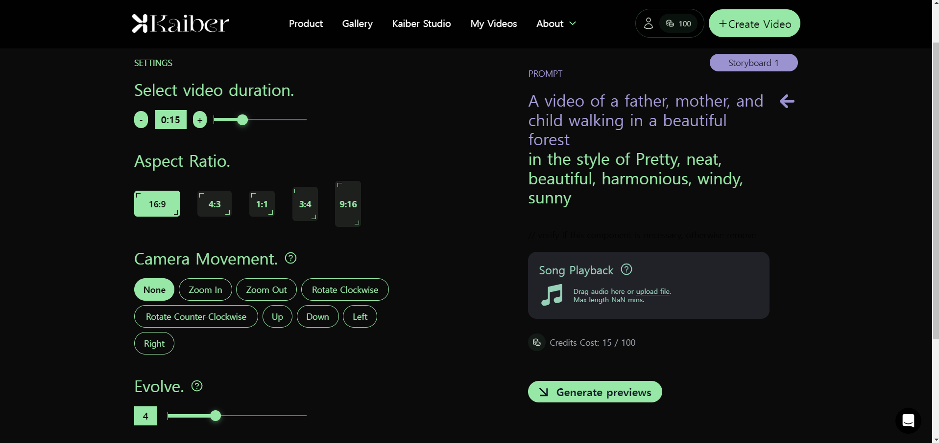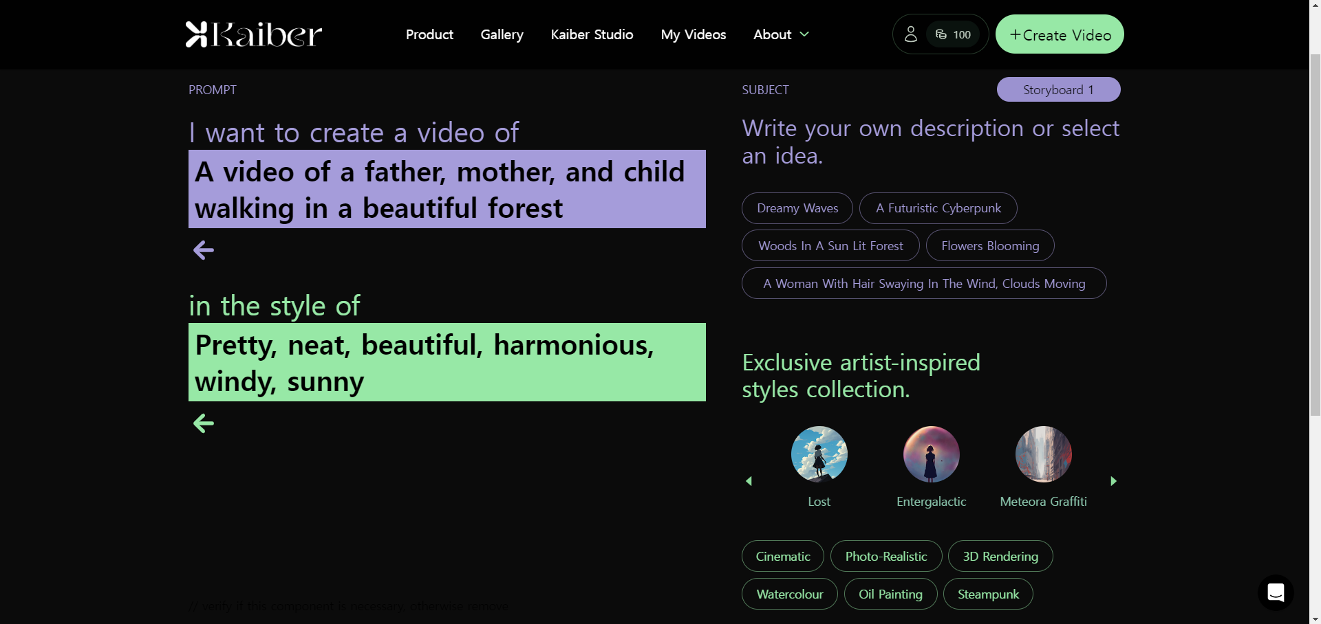 (3) 예시를 들어드리겠습니다. 먼저 저는 주제를 입력하는 프롬프트 칸에는 'A video oh a father, mother, ane child walking in a beautiful forest'라고 적어주었습니다. 그리고 스타일을 입력하는 프롬프트 칸에는 'Pretty, neat, beautiful, harmonious, windy, sunny'라고 적어주었습니다.