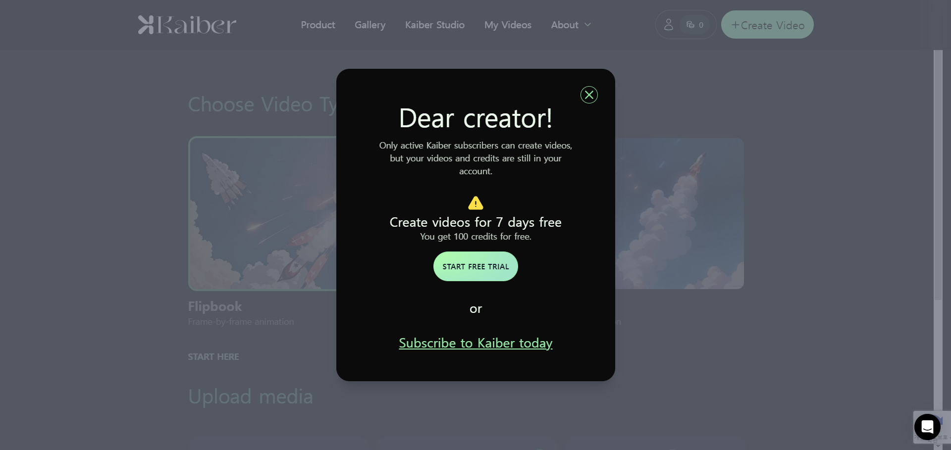 위 화면은 Kaiber를 7일 동안 무료로 사용할 수 있고, 그 이후에는 유료 사용이라는 것을 알려주고 있습니다.