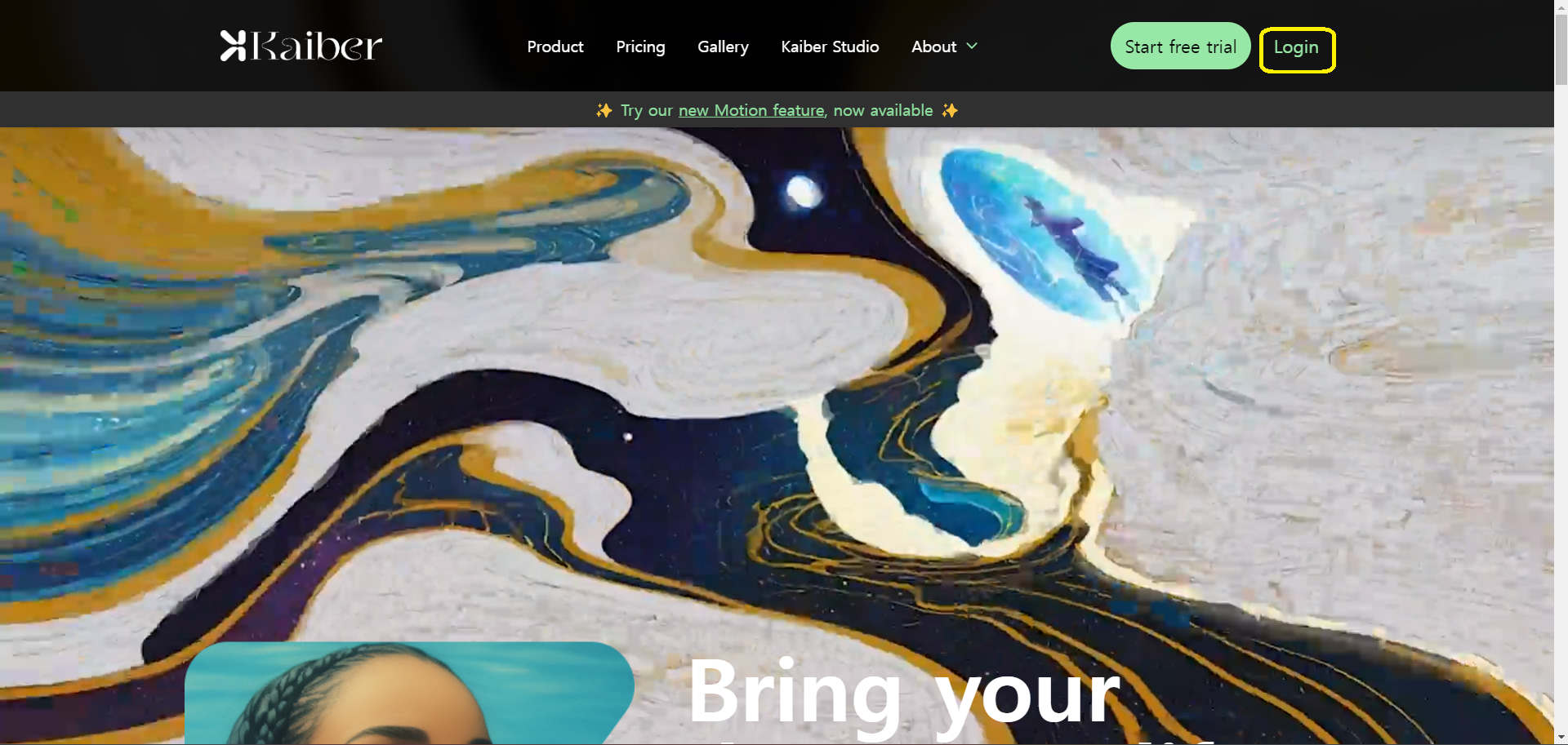 (1) 먼저 네이버 또는 구글 등 인터넷 검색창에 'Kaiber'라고 검색하시면 사이트가 뜨게 됩니다. Kaiber 사이트로 접속을 해줍니다. 사이트로 접속을 하시게 되면 위와 같은 화면이 나타나게 됩니다. 이때 위 사진의 노란색 박스로 되어있는 'Login'을 클릭해줍니다.