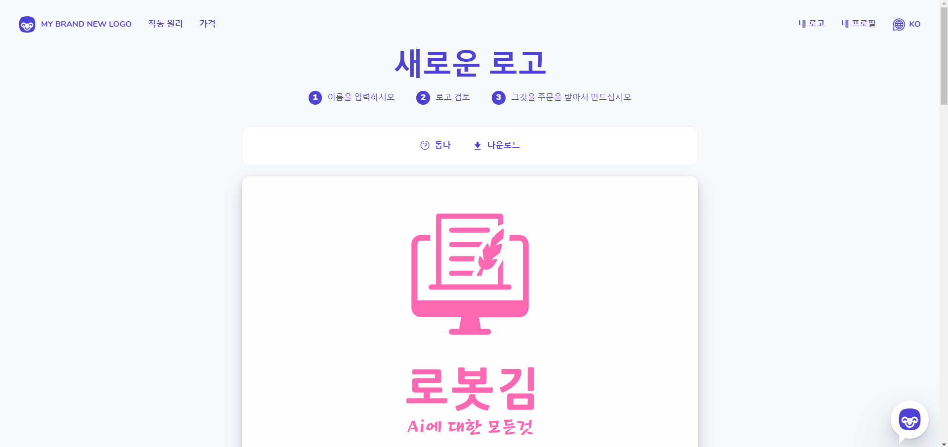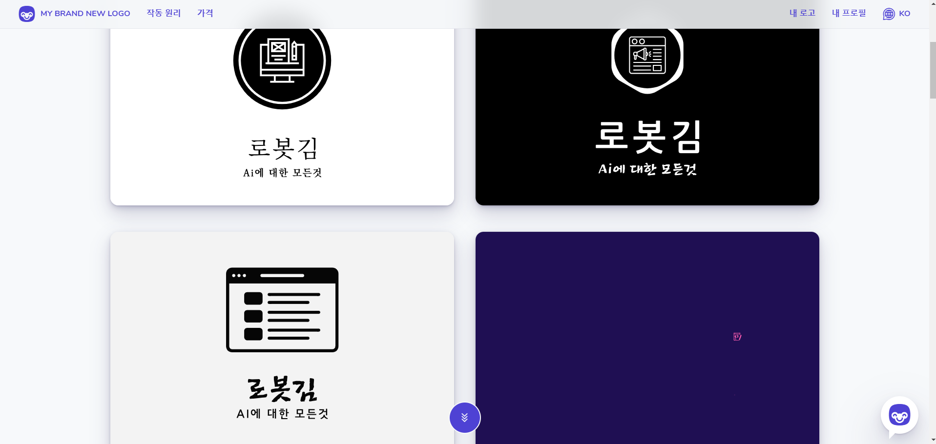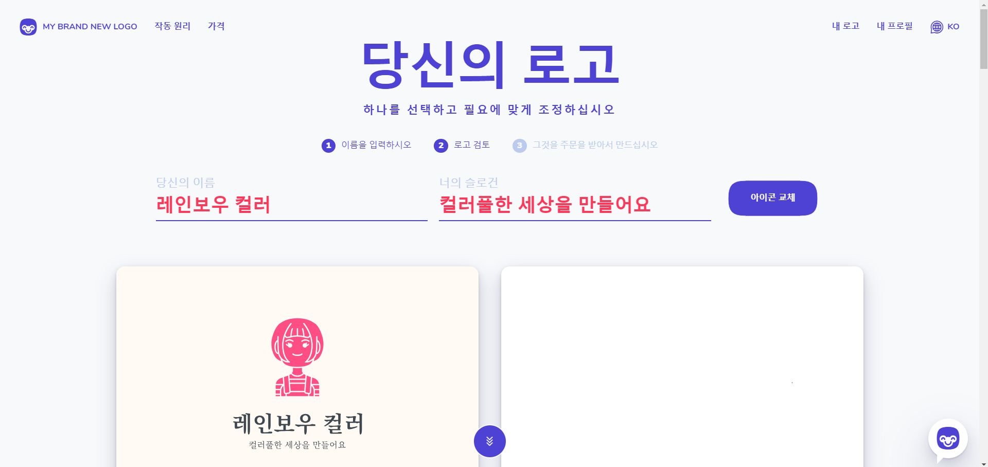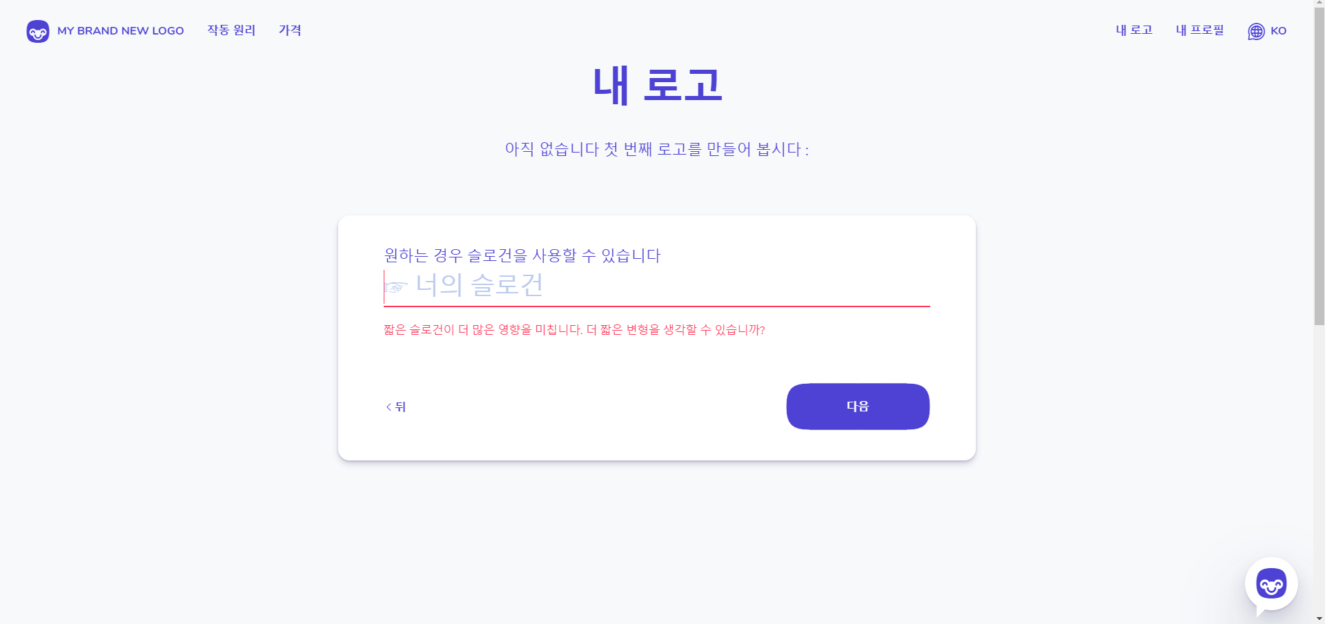 (1) 먼저 네이버 또는 구글 등 인터넷 검색창에 'My Brand New Logo'를 검색해줍니다. 그러면 사이트가 나올 텐데요 사이트 주소는 https://mybrandnewlogo.com/ko가 되겠습니다. 사이트로 접속하셔서 들어오시게 되면 위와 같은 화면이 나오게 됩니다.