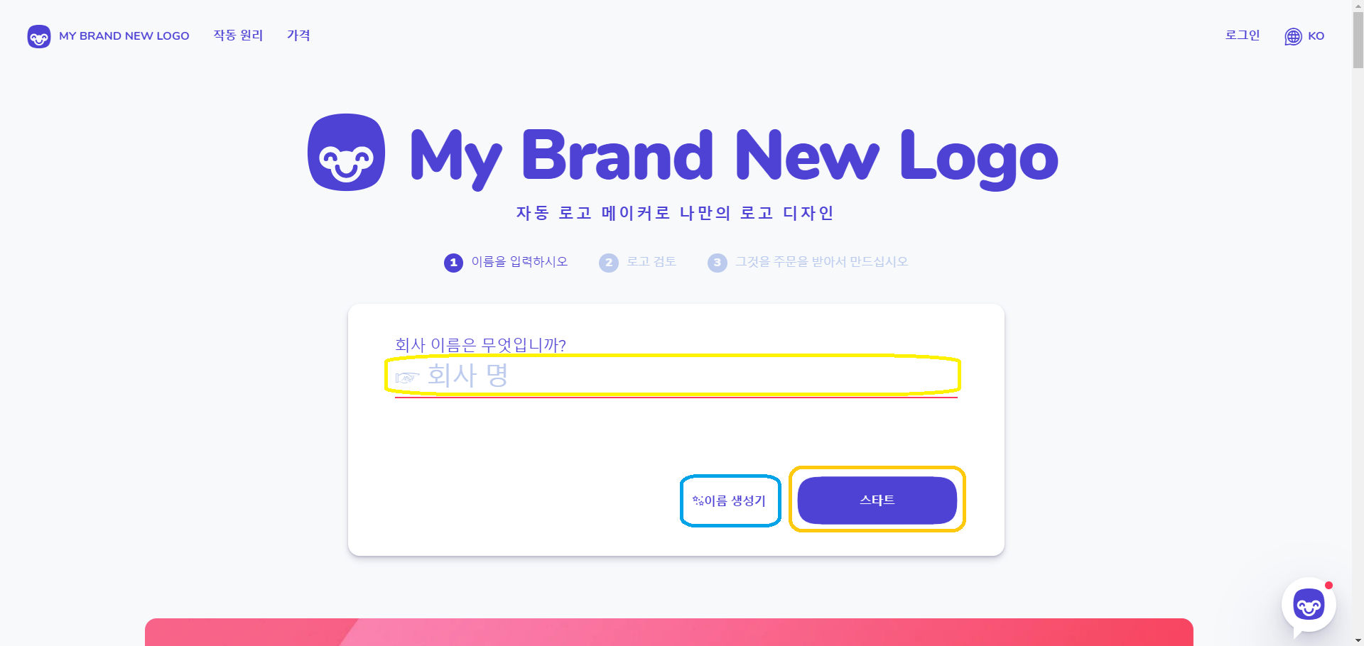 (2) 만약 아직 회사명이 없으시거나 못 정하신 분들께서는 위 화면에서 파란색 네모 박스로 되어있는 '이름 생성기'를 클릭해주셔서 My Brand New Logo 활용해서 회사명도 만드시면 되겠습니다.